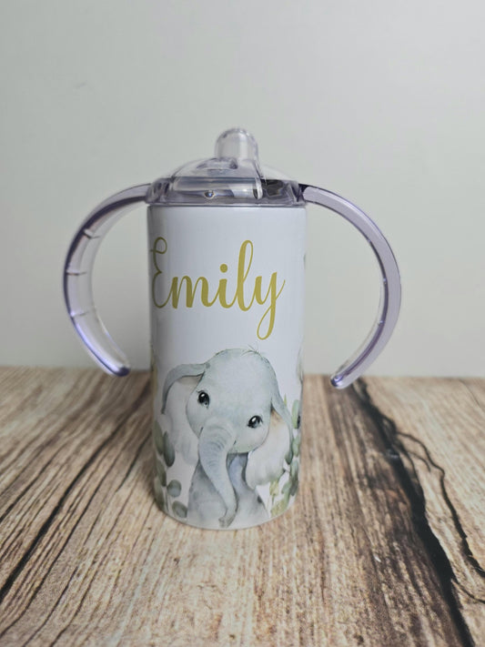 Personalised sippy cup with wide handles, Safari animal drinks bottle, 12oz tumbler with straw, drinking beaker, Elephant, Zebra, giraffe