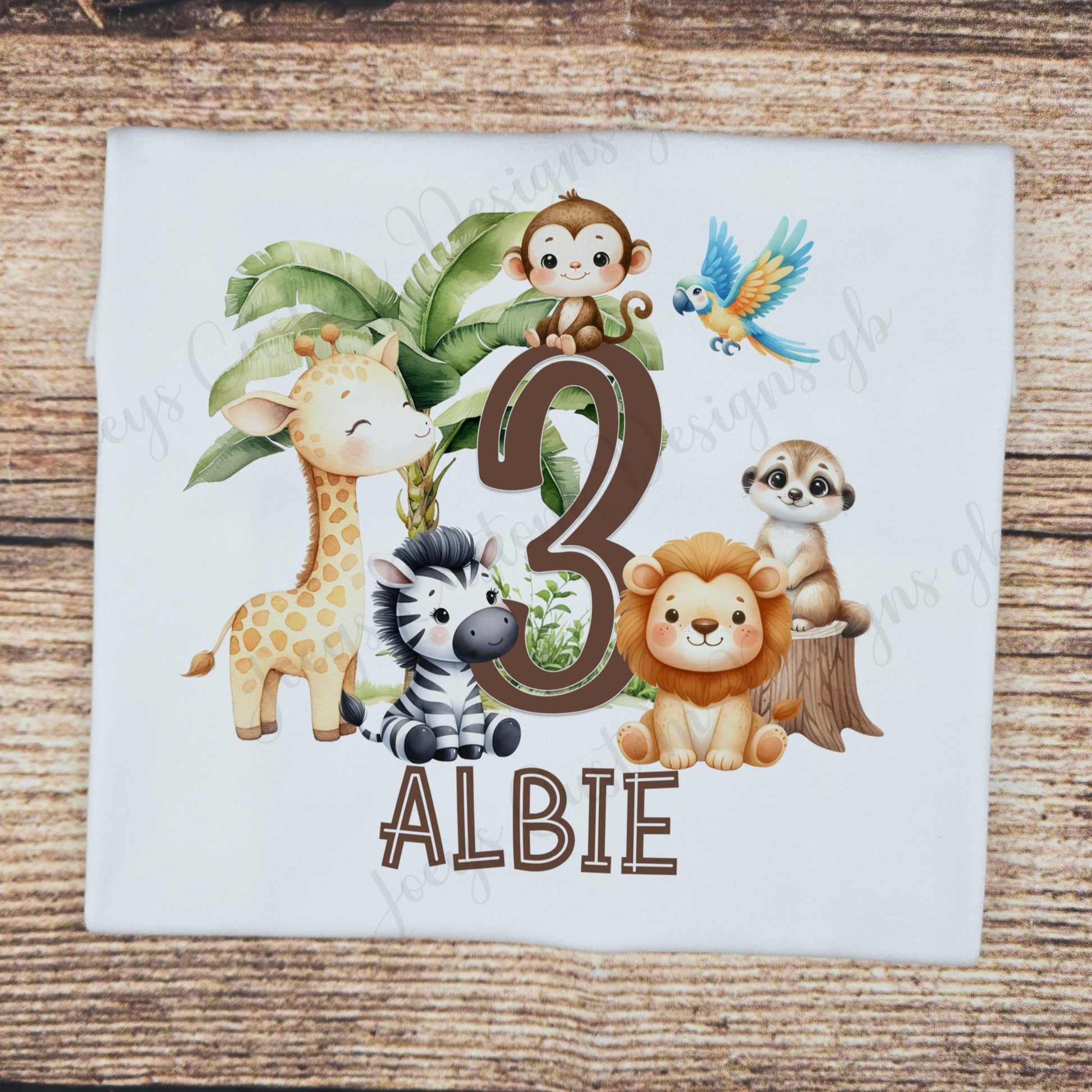 Childrens personalised birthday tshirt, Childs jungle animal number shirt, Kids celebration tee, Birthday gift, photo prop