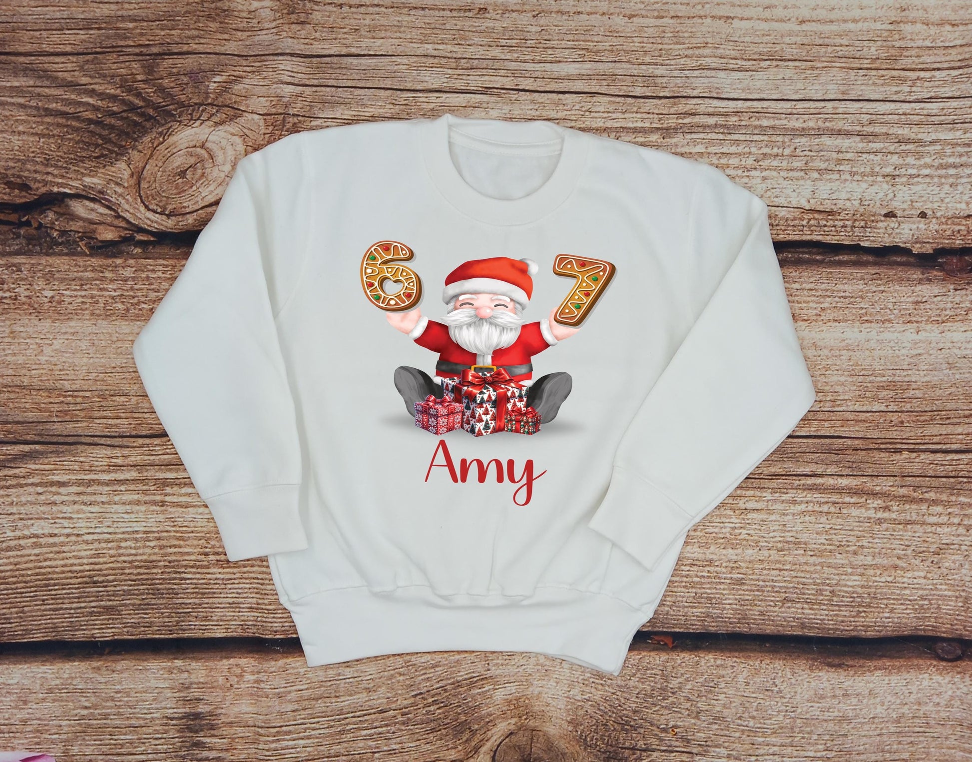 This soft sweater depicts a Father Christmas sitting behind some presents holding cookies in the shape of the number 6 and 7. This would make a great gift for Christmas jumper day this festive season.