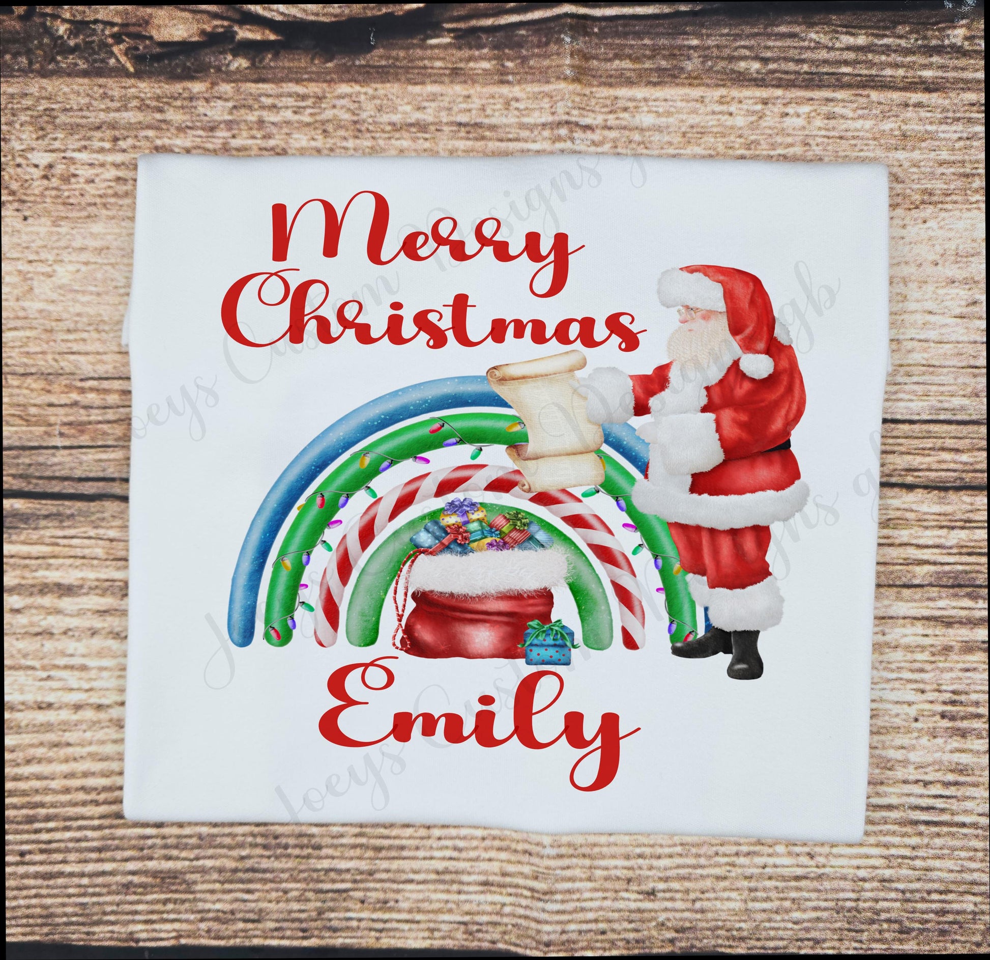 This festive t-shirt depicts Father Christmas with his sack and list in front of a rainbow. The wording says 'Merry Christmas' and can be personalised with a name. This would make a great gift this festive period and is sure to get little ones excited for Santa's arrival.