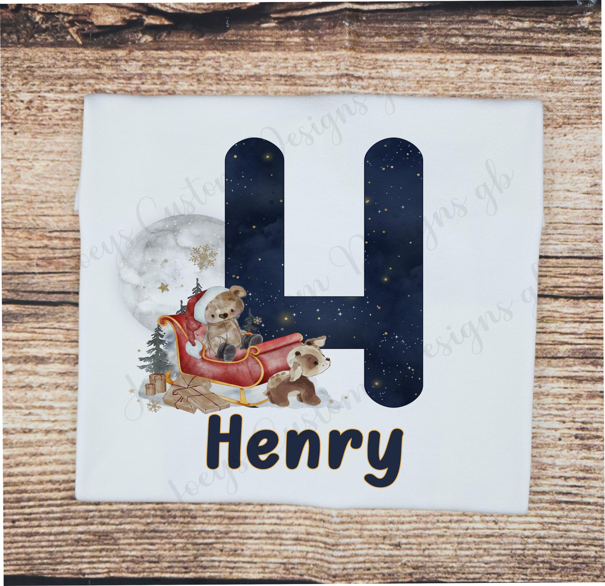 This festive t-shirt depicts a teddy bear wearing a Santa hat riding a sleigh pulled by a stuffed toy reindeer in the moonlight alongside a large initial that can be customised according to your needs. The top can also be personalised with a name. This shirt would make a great gift or addition to a little ones wardrobe this festive period.