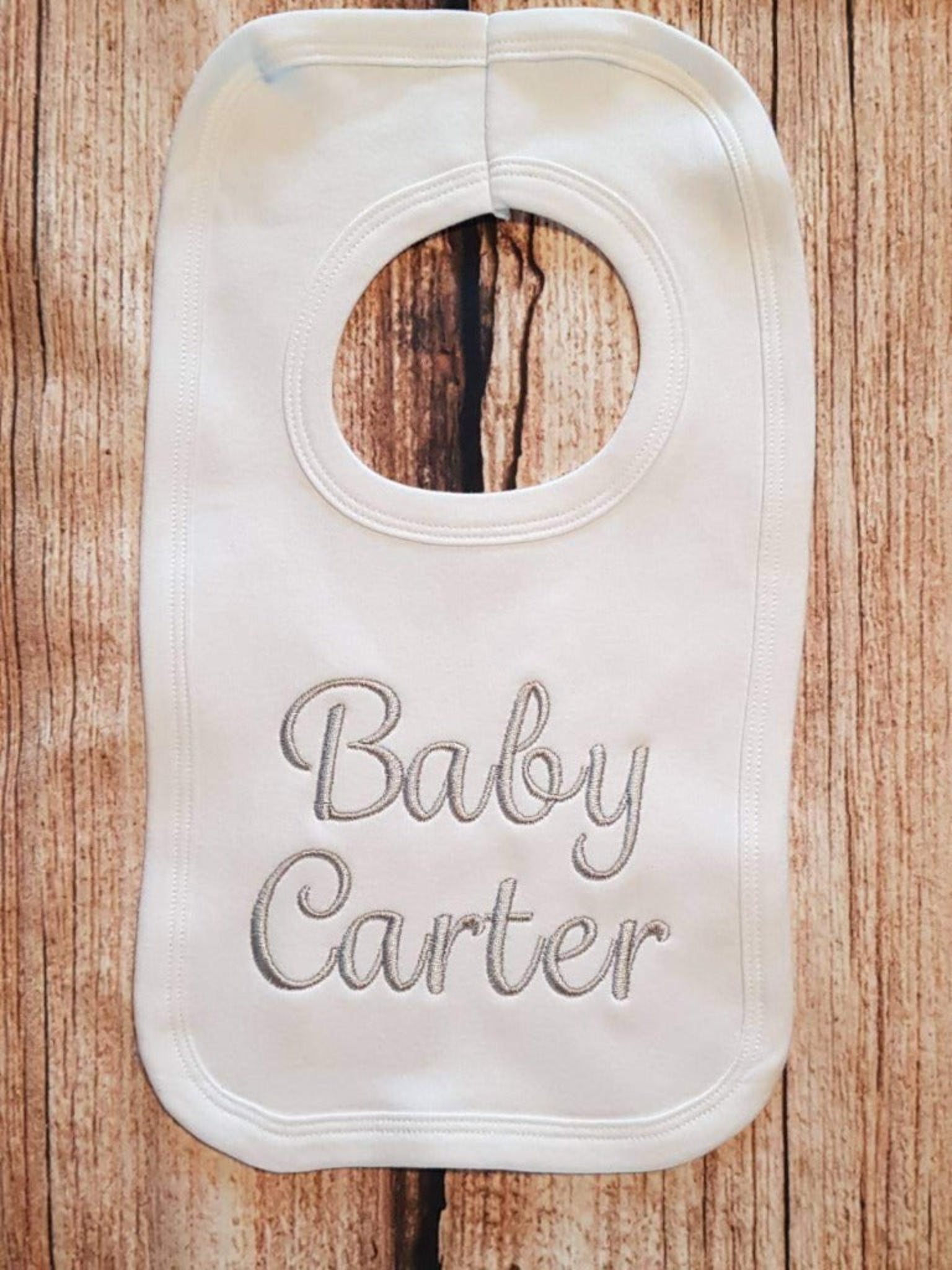 This cute personalised baby bib can be embroidered with a baby's name or initials. This would make an ideal gift for a new born baby or as a christening present. The name can be stitched out in a variety of colours, however if you do not see the colour you require please feel free to ask and I will try to meet your requirements.