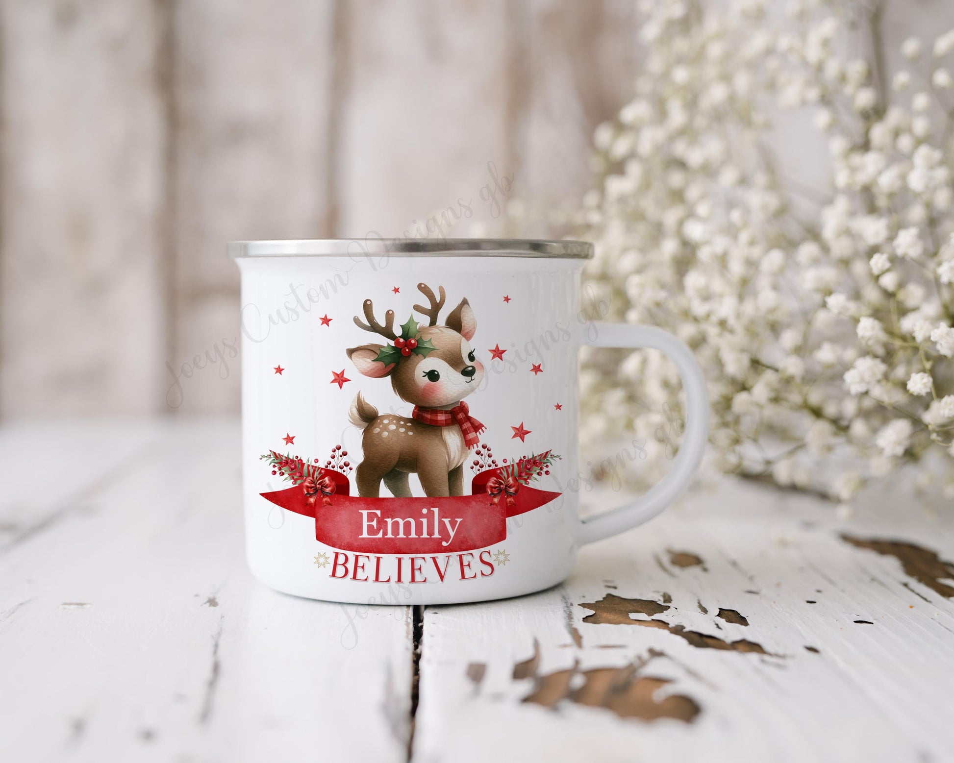 This enamel mug depicts a festive reindeer with the wording 'name believes' the design is embellished with stars and festive trimmings. The mug can be personalised with a name.